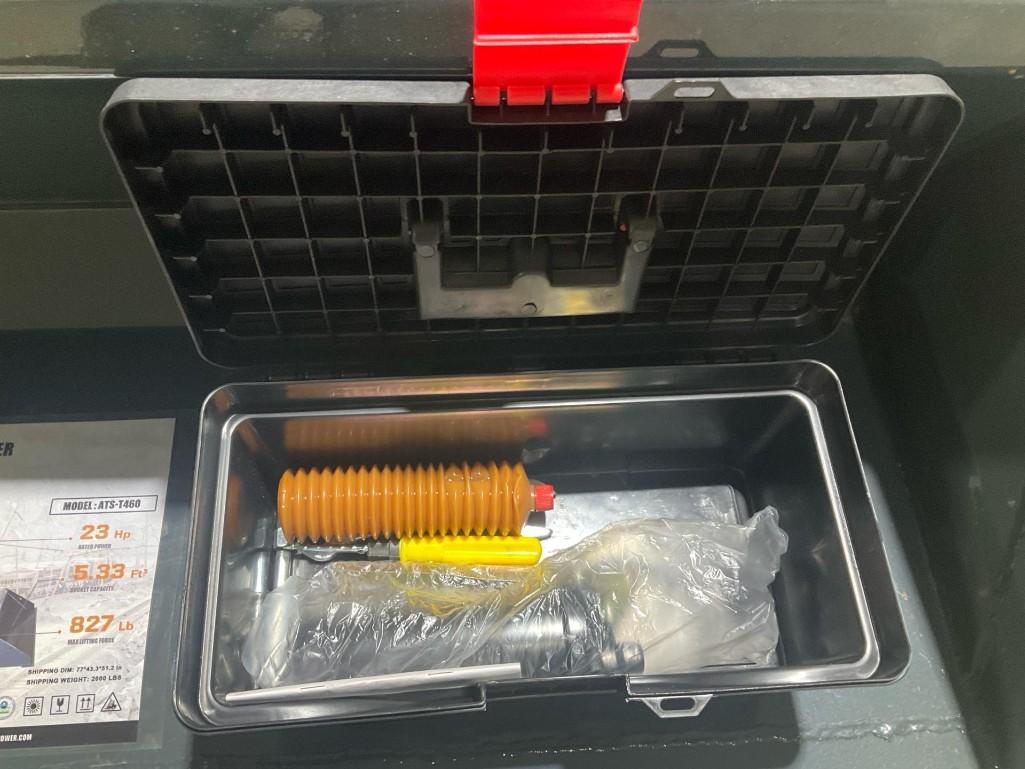 -- Specification & Features -- Model: ATS-T460. Make: ATS. Lifting Capacity: 840 lbs. Engine Capacity: 23 HP. Engine Displacement/Cylinders: 739 cc / 2 cylinders. Motor Speed: 3600 RPM. Cooling Method: Air-cooled. Travel Speed: 3 MPH. Standard Lifting Capacity: 770 lbs. Hydraulic Drive System: 180 Bar. Hydraulic Oil Tank Capacity: 20 Qt. Electrical System: 12 V. Dump Height: 60". Braking System: Hydraulic Closed Brake. -- Contact -- Specialist: Myron Miller, 574-536-6306. Please review the Important Information Lot at the beginning of the auction for full details before bidding.