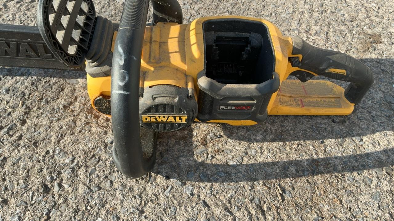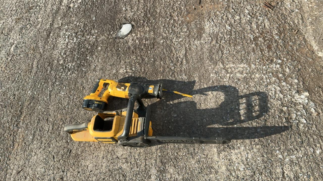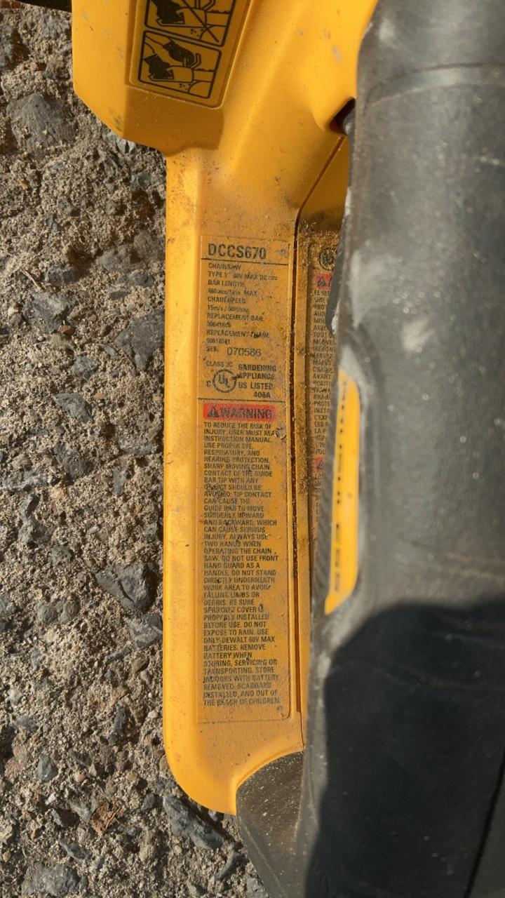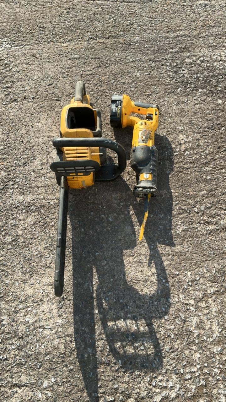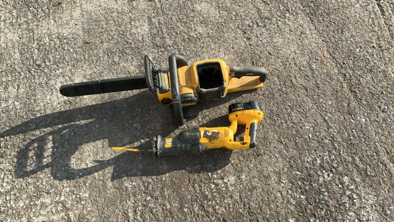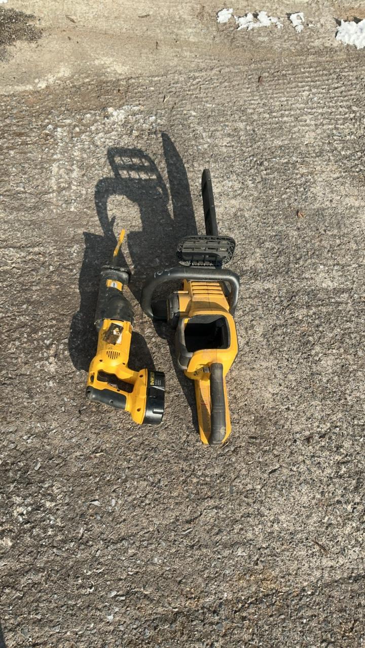 -- Description -- DeWalt DCCS760 Chainsaw Serial Number: 070586 Bar Length: 16″ Batteries: Not Included DeWalt DC385 Variable Speed Reciprocating Saw Includes Battery: DC9096 18V Blade Length: 6 1/2″