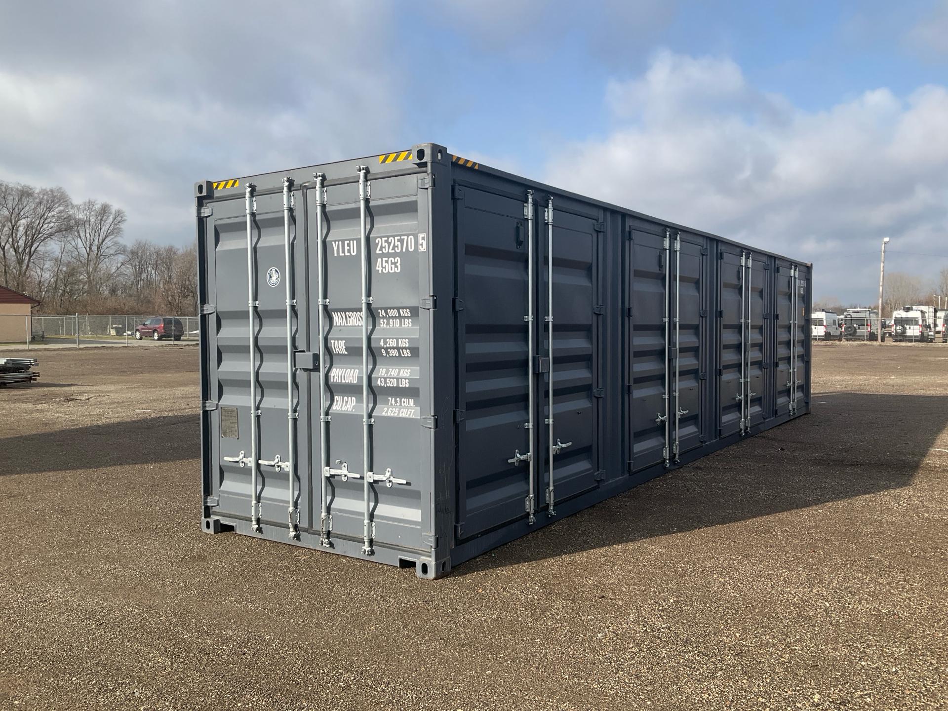 -- Description -- Side doors: 4, Dimensions: 96” wide x 114” tall. Side doors dimensions: 91” wide x 99” tall. Color: Charcoal. -- Contact -- Specialist: Myron Miller, 574-536-6306.