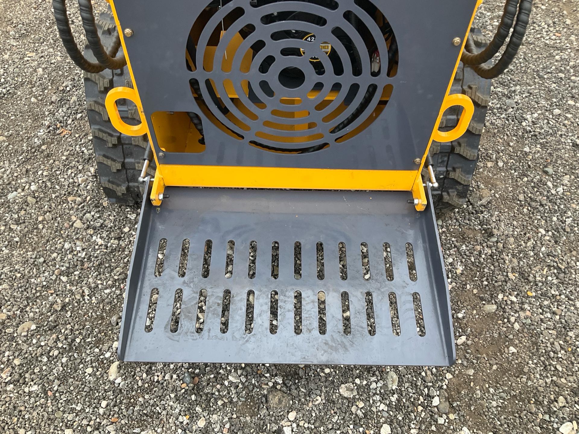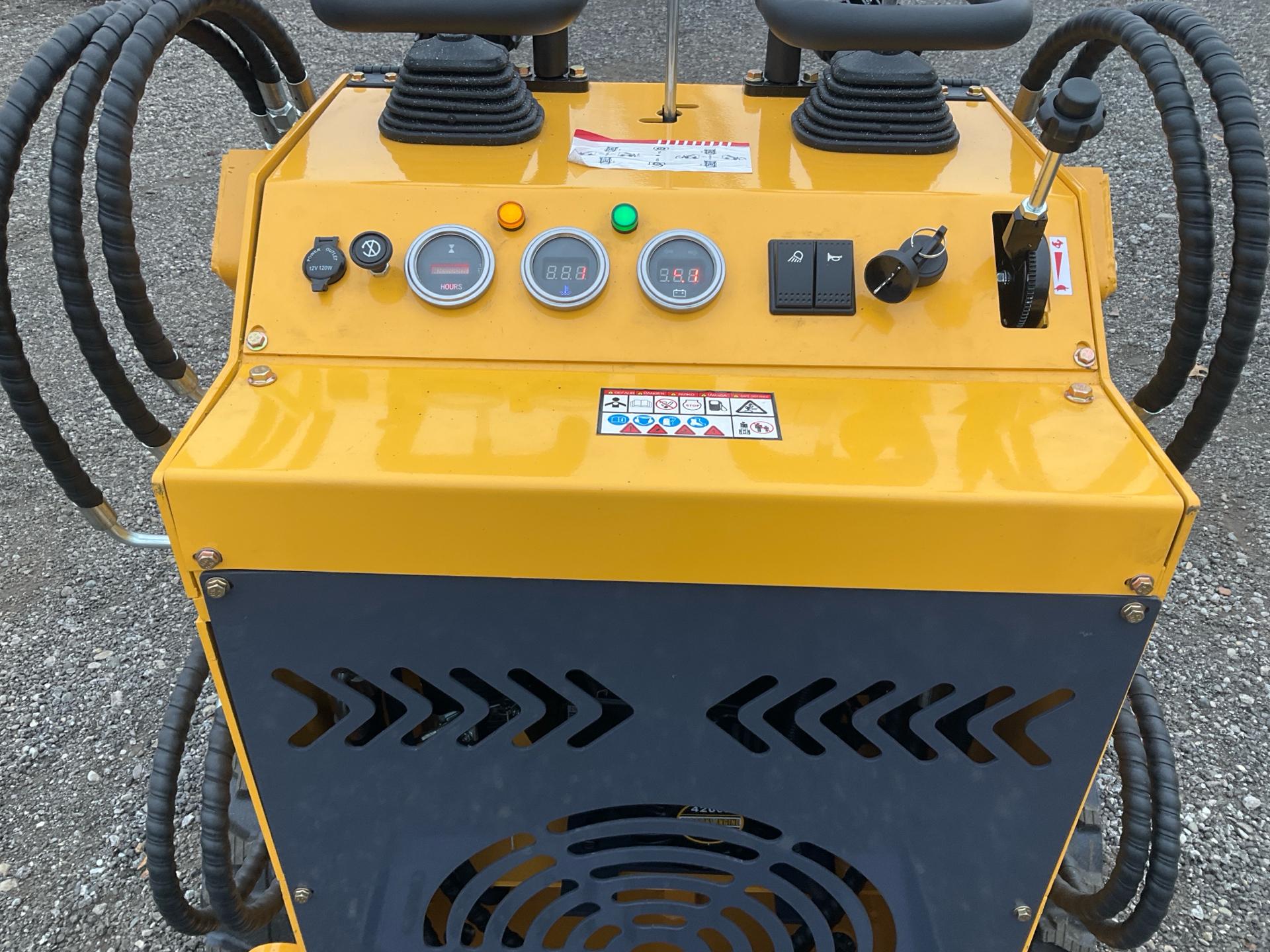 -- Description -- Model: ZJZ-380 13.5 HP gasoline engine 420 cc Electric start Stand‑on operator platform Rated lifting force: 441 lb Hinge‑pin height: 70.9 in Dump height: 58.3 in Forward reach at dump: 16.9 in Travel speed: up to 3.7 mph Gradeability: 25% Auxiliary hydraulics with quick‑connect Bucket capacity: 5.3 cu ft Ground clearance: 4.3 in Universal mini‑skid attachment plate -- Contact -- Specialist: Myron Miller, 574-536-6306.