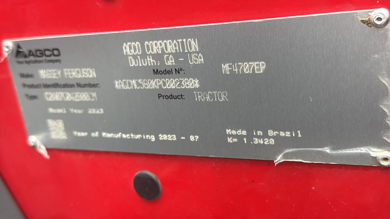 -- Specifications & Features -- Year: 2023. Make: Massey Ferguson. Model: 4707. Serial #: AGCMC580KPC002380. Engine: Agco Power. Fuel: Diesel. Meter Reads: 136. Drive: 4WD. Horsepower: 70. Transmission: shuttle shift. 3 Point Hitch: Yes. Rear PTO: yes. -- Seller Statement -- 931X loader with 84” bucket, nearly new, one owner, low hours, liquid filled rear tires, runs and operates, owner selling because it’s a little too big for his needs -- Location -- Cub Run, KY. -- Contact -- Specialist: Dale Nissley, 574-821-6014.