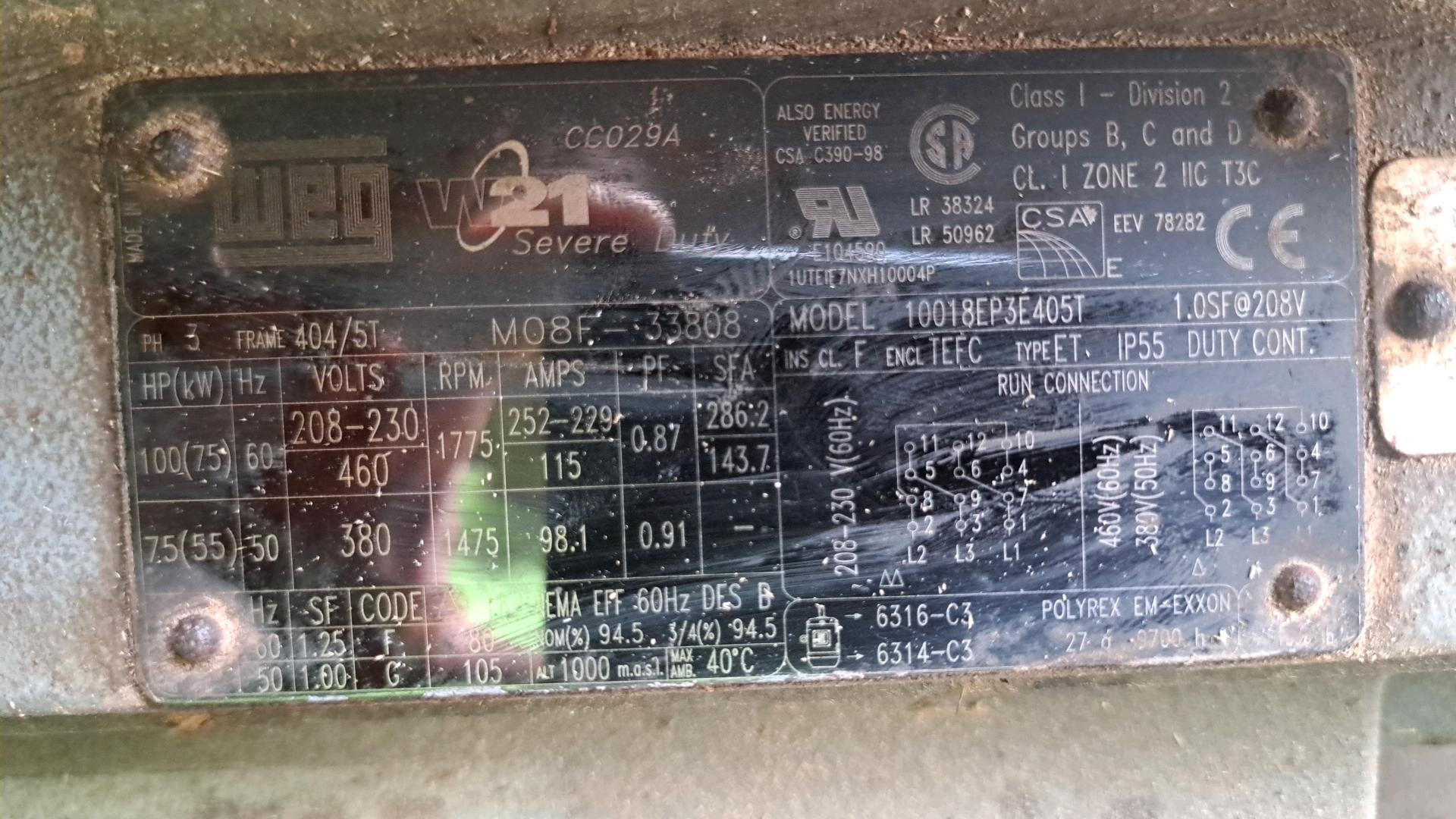 -- Specifications & Features -- Make: Precision. Model: unknown. Serial #: unknown. Drive Type: Electric. # of Knives: 3. Discharge: Top. -- Seller Statement -- Weg 3 phase 100 hp electric motor, like new soft Start included -- Location -- 650 Stricklers Town Rd, Newmanstown, PA 17073.. -- Contact -- Specialist: Eugene Hochstetler, 574-242-1100.