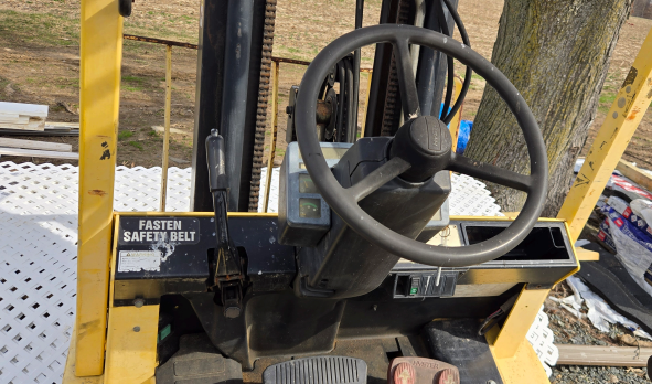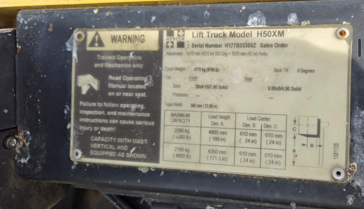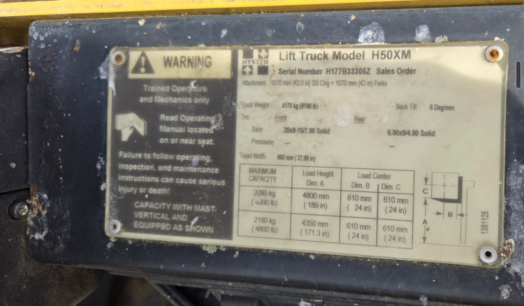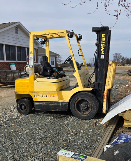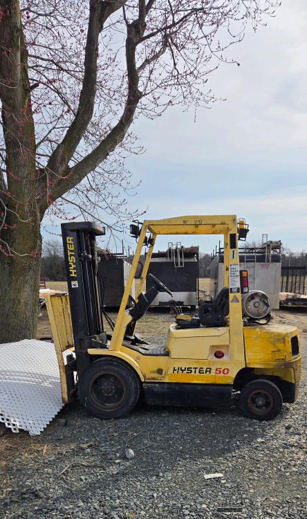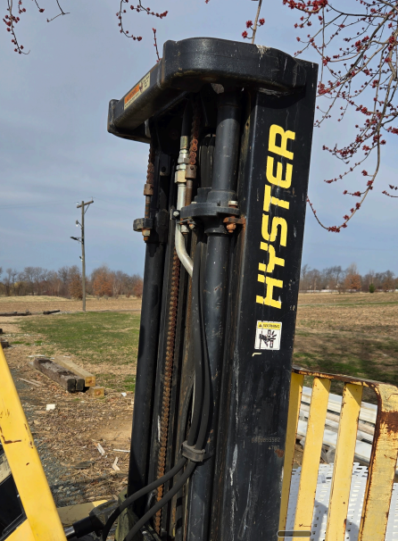 -- Specifications & Features -- Year: 2000. Make: Hyster. Model: Cap. Serial #: H177B33305Z. Fuel: LP. Meter Reads: na. Stage Mast: 3. ROPS: Open. Tires: Solid. Tire Size: Front 28x9 15/7. Back 6.00x9/4. Reach Height: 189". Load Capacity: 4,800 lbs. -- Seller Statement -- All proceeds go to St. Jude Children's Research Hospital. Machine does run and is operational, but it does not back up. Reverse does not work. -- Location -- Middletown, DE. -- Contact -- Specialist: Dale Nissley, 574-821-6014.